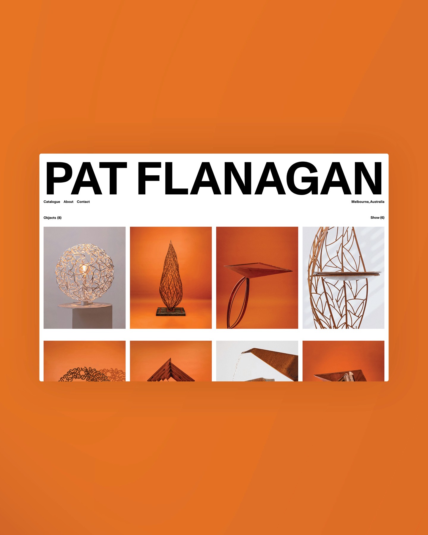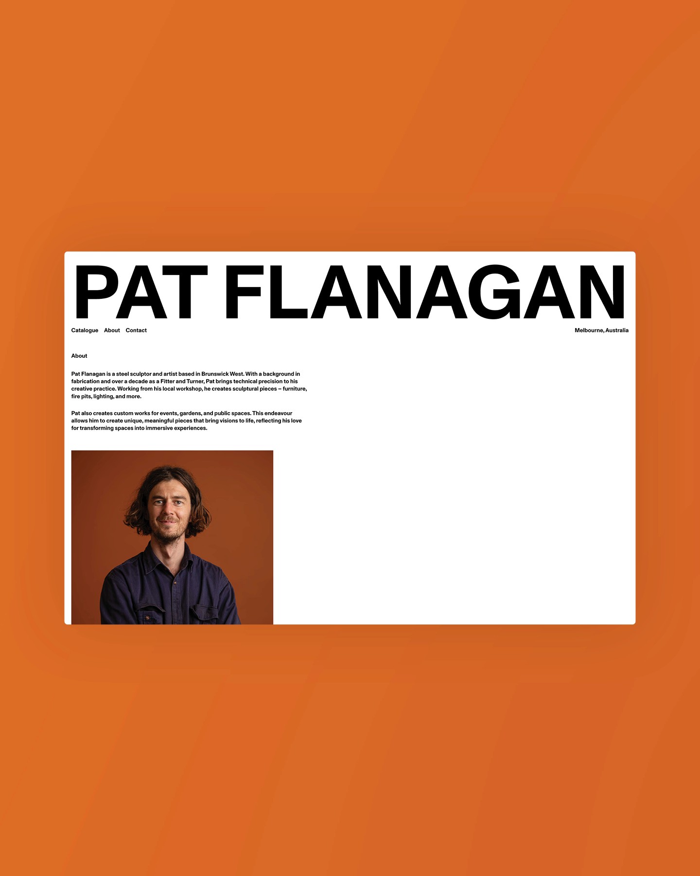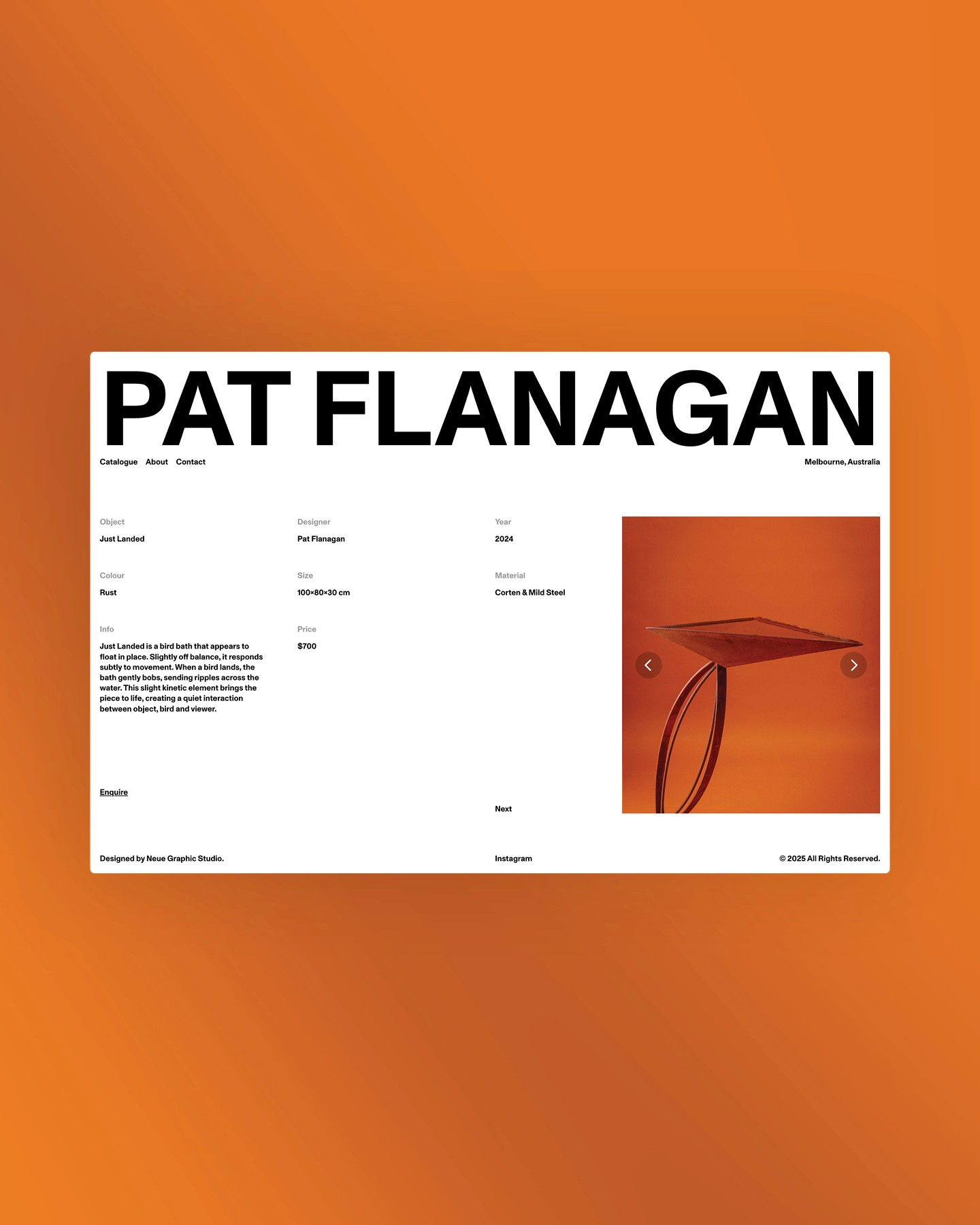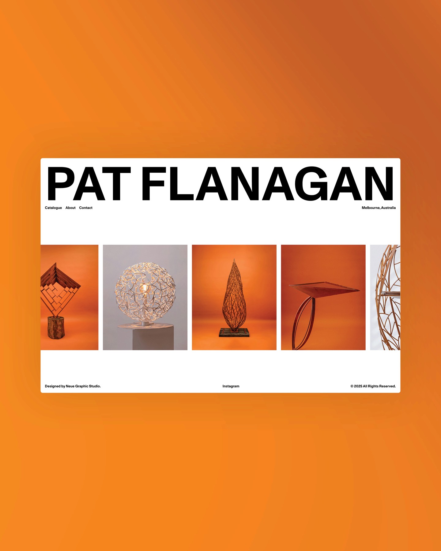 Pat Flanagan is a Melbourne-based sculptor transforming steel into functional, tactile works with a distinct artistic presence. Neue Graphic designed a minimal, gallery-style website that showcases Pat’s craftsmanship and storytelling, pairing immersive imagery with restrained design to reflect the materiality, precision, and interactive nature of his sculptures.